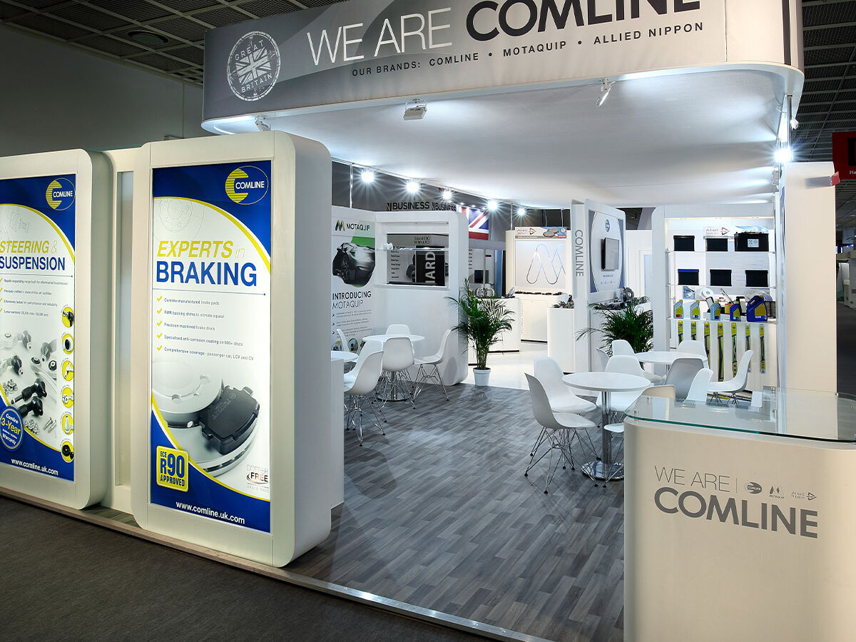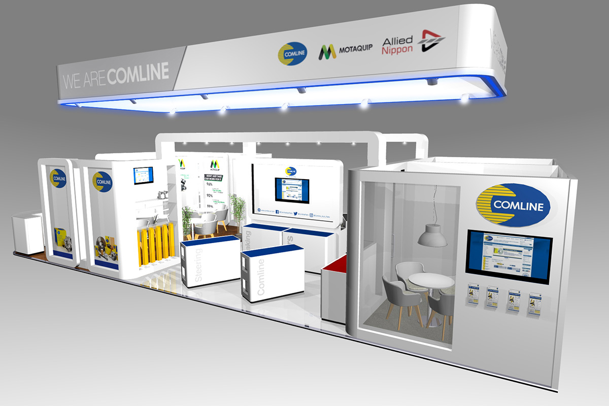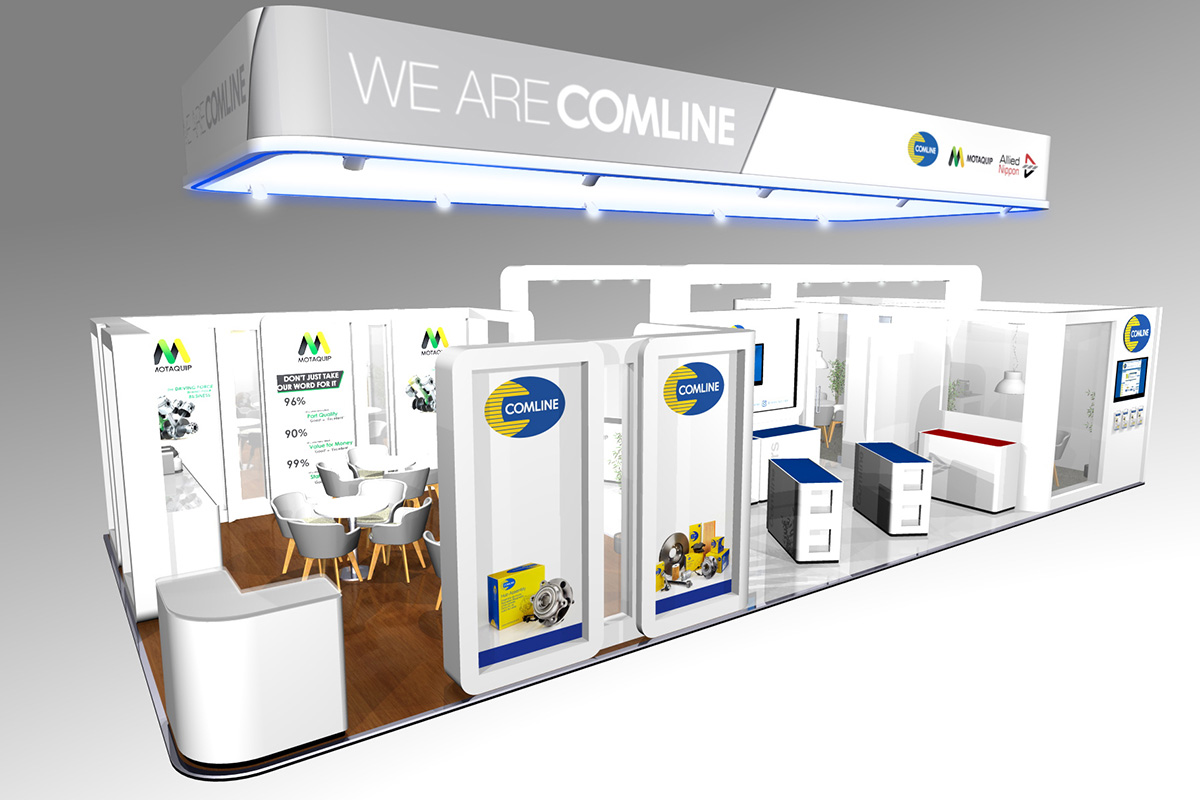 Comline up their game for Automechanika 2018 but almost trebling the size of their exhibition stand. This 13m x 6m stand was split into 3 distinctive areas covering a number of brands. The first area for welcoming and casual meetings, the second area for displaying product on custom built pods and finally two large private meeting rooms with large glass windows and door. Codex designed this stand from scratch and managed the project all the way to sign off.