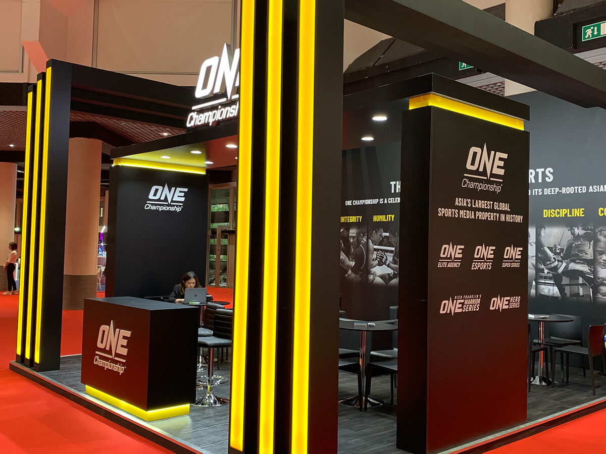 Codex have been one of the official stand builders and preferred contractors at Sportel Monaco for several years now. This means we get to meet clients from all over the world. In summer 2019 we were contacted by the team at One Championship, a company based in Singapore. After a number of phone call and emails, Codex provided them with a number of stand designs. Within a few weeks, a design was chosen and submitted to organisers. The end result was this striking stand all in black and yellow.