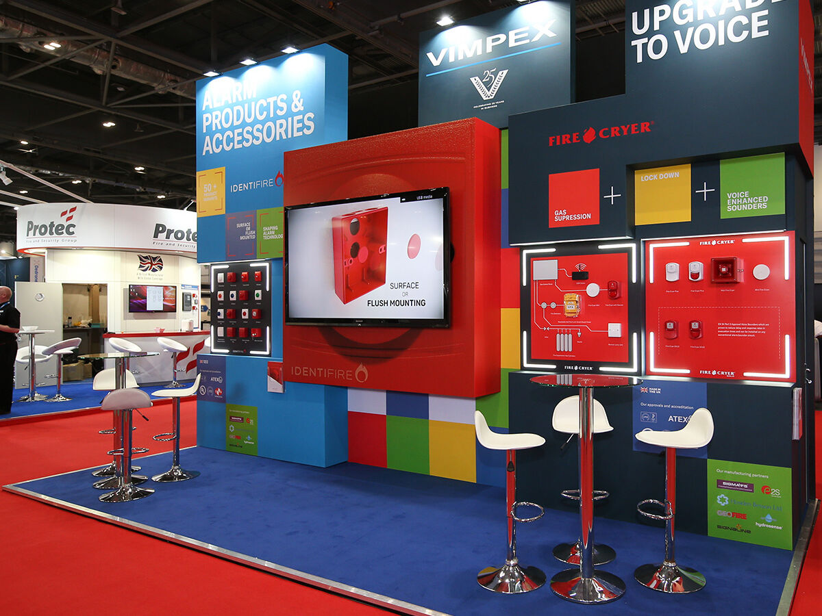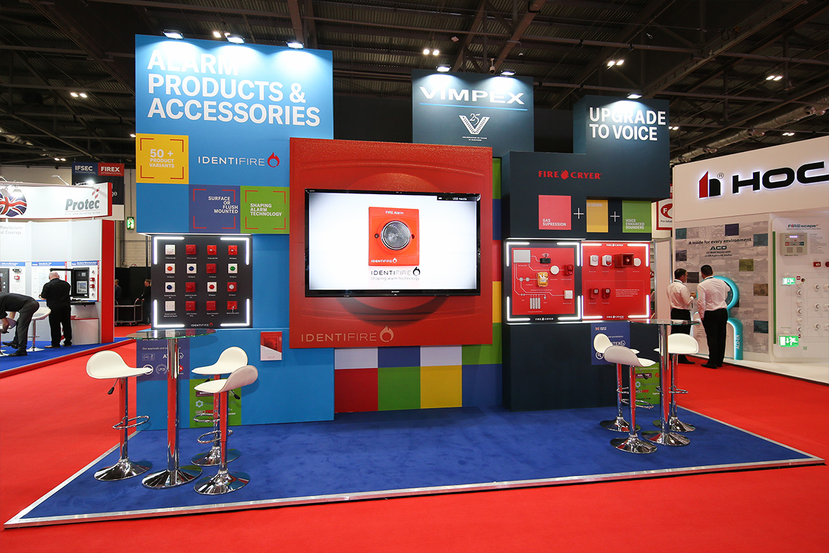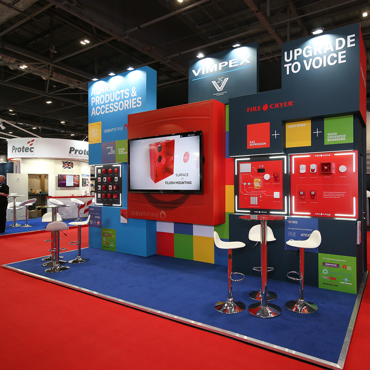 An eye catching stand with 3 dimensional boxes coming out from store wall at various sizes. Strong use of colour and with a heavy load of applied vinyl and printed graphics, the client at Vimpex was over the moon with the final look of the stand. 80” LED at the centre of the stand provided and installed by Codex.