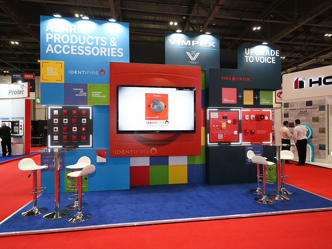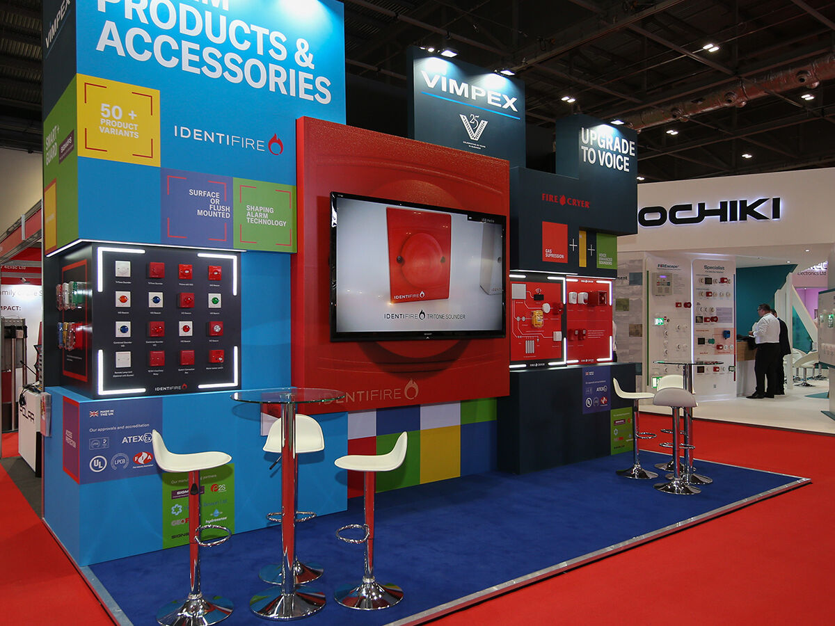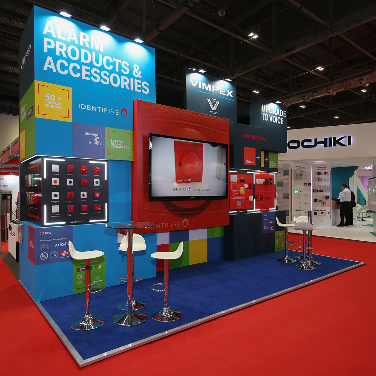 An eye catching stand with 3 dimensional boxes coming out from store wall at various sizes. Strong use of colour and with a heavy load of applied vinyl and printed graphics, the client at Vimpex was over the moon with the final look of the stand. 80” LED at the centre of the stand provided and installed by Codex.